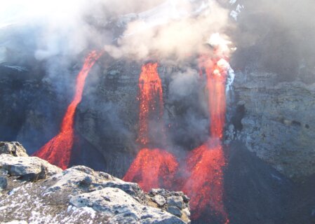 Lavafälle am Fimmvörðuháls (Island). Nach einem intensiven Erdbebenschwarm öffnete sich Ende März 2010 eine Ausbruchsspalte auf der Ostflanke des Eyjafjallajökulls. Der Lavastrom ergoss sich in die Schlucht Hrunagil (Foto). Wenige Tage nach Ende der Spalteneruption begann ein explosiver Ausbruch im Hauptkrater des Eyjafjallajökulls, der mit seiner berühmten Aschewolke für tagelange Sperrungen des Luftraums in Mitteleuropa sorgte.