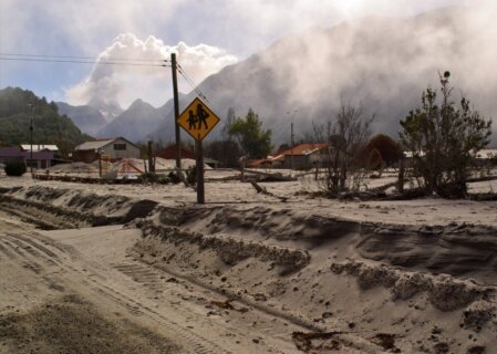 Chaiten ist ein rhyolitischer Subduktionszonen-Vulkan mit einer Gletscher-gefüllten 3-km Caldera im Süden Chiles, der nach fast 400 Jahren Ruhe in 2008 wieder aktiv wurde. Nach einer explosiven Eruptionsphase im Mai 2008 verlagerte sich die Aktivität mehr zum Wachstum eines Lavadoms bis in 2010. Bis 2013 folgten kleine Dampf- und Asche-Explosionen und in 2015 gab es nochmal eine Phase intensiverer seismischer Aktivität. Eine Bresche im Calderarand mündet in ein Tal, das sich etwa 10 km bis zur Küste erstreckt, wo das Dorf Chaiten liegt. Dank der seit dem 2. Mai stetig anwachsenden Bims- und Aschedecke (aus bis zu 30 km hohen Eruptionssäulen und proximalen pyroklastischen Strömen) strömten Lahars durch das Tal und überfluteten große Teile des Ortes (die rund 4000 Einwohner waren glücklicherweise bereits evakuiert), Häuser versanken bis zu halber Höhe im Schlamm, wurden zerstört oder mit den Lahars in die Meeresbucht geschwemmt. Die Schichtung und Korngrößenwechsel im Straßenanschnitt dokumentieren mehrere Lahar-Ströme.